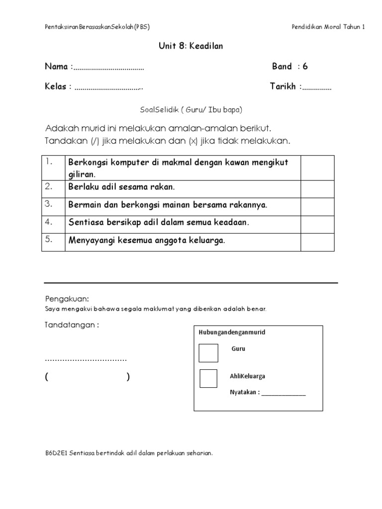 Insrument Pbs Kssr Pendidikan Moral Tahun 1 Keadilan Band 6 Pdf
